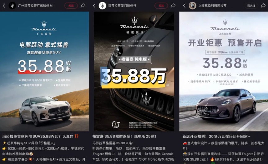 今年7月,“上海浦东玛莎拉蒂”就曾发布海报称,玛莎拉蒂的SUV车型Grecale(格雷嘉)限时尊享价38.88万元起。官方信息显示,玛莎拉蒂Grecale的指导价为65.08-103.88万元,相比之下经销商的起售价低了26.2万元。