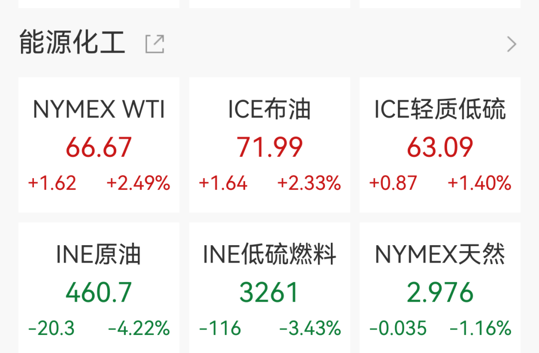 石油股强势爆发, BATTALION OIL涨超34%, TMD ENERGY涨近20%, 南非萨索尔涨近10%, 西方石油公司股价触及盘中高位,收涨9.36%,报每股超51.5美元。消息面上, 国际原油期货大幅走高,创下了反弹新高,WTI原油、ICE布油均涨超2%。