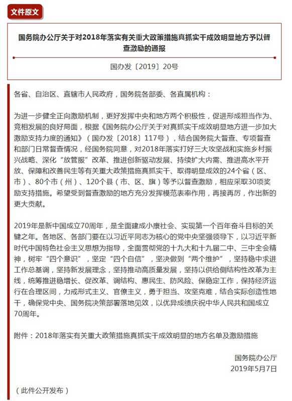 东莞阳光网讯 (全媒体首席记者 林泽珊)5月10日,国务院办公厅印发通报,对2018年落实重大政策措施真抓实干成效明显的地方予以督查激励。其中,广东省东莞市在深化商事制度改革、加强事中事后监管领域获通报表扬。这是继2016年度东莞因推动工商注册制度便利化工作及时到位、落实事中事后监管等相关政策措施社会反映好获得国务院表扬激励后,再次获得国务院督查激励。东莞也是2018年广东省唯一一个在商改领域受到督查激励的城市。
