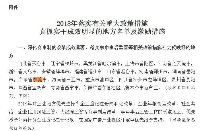 国务院在通报中明确,对包括东莞在内的19个在商改领域获督查激励的城市,2019年将优先选择为企业登记注册便利化改革、企业年报制度改革、社会共治、企业信用风险监管、大数据监管等商事制度改革、事中事后监管工作的试点地区;优先授予外商投资企业登记注册权限;在国家广告产业园区评定中优先给予支持。