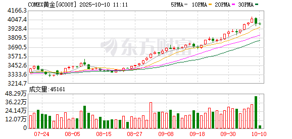 美东时间10月9日,现货黄金、现货白银价格双双在盘中创出历史新高后转跌,现货黄金价格跌破4000美元关口,截至发稿,现货黄金价格报3990.24美元/盎司。截至10月9日收盘,COMEX黄金期货大幅收跌1.95%,报3991.1美元/盎司;COMEX白银期货收跌2.73%,报47.655美元/盎司。