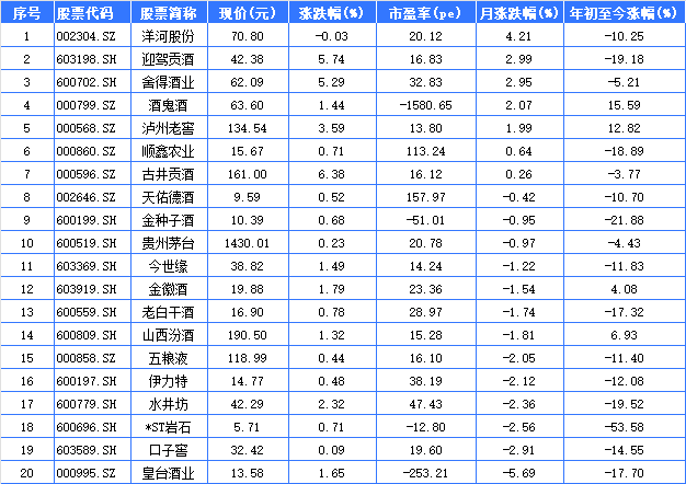 数据显示,20只白酒A股当月7家上涨,13家下跌。