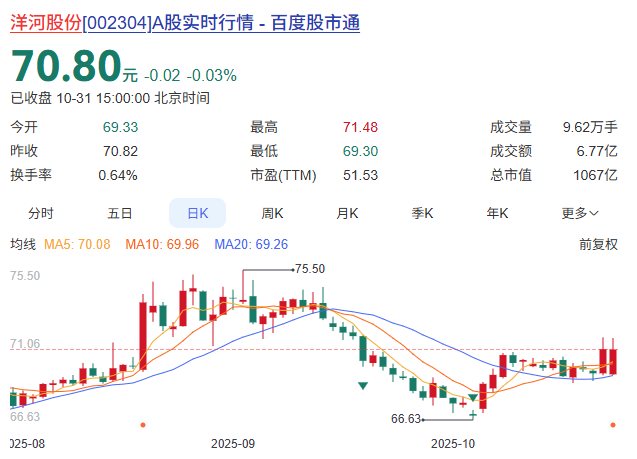 10月31日,洋河股份下跌0.03%,以70.80元报收,换手率0.64%,成交量9.62万手,成交额6.77亿元,总市值1067亿元,本月涨幅累计4.21%,居第一,今年以来涨幅累计-10.25%。