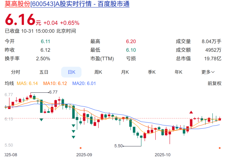10月31日,莫高股份上涨0.65%,以6.16元报收,换手率2.50%,成交量8.04万手,成交额4952万元,总市值19.78亿元。