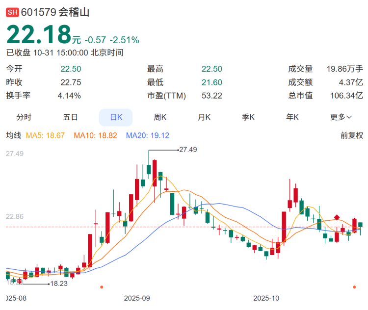 10月31日,会稽山下跌2.51 %,以22.18元报收,换手率4.14%,成交量19.86万手,成交额4.37亿元,总市值106.34亿元,本月涨幅累计8.09%,今年以来涨幅累计108.07%。