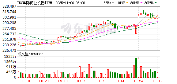 11月6日,IBM收盘每股报306.77美元,上涨1.97%。总市值2867亿美元。