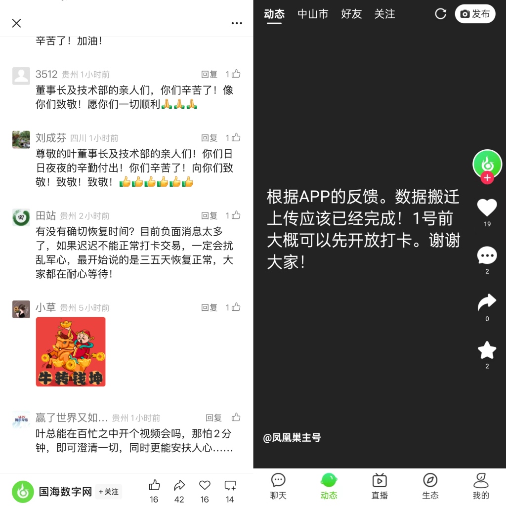 此后,各类相关消息在社交平台持续发酵。有个人账号宣称“数据搬迁上传已经完成!1号前大概可以先开放打卡。”;12月2日,微信公众号“国海网报”发布消息称“一周左右恢复系统,总部即将官宣”;更有标注为叶建益的账号直接预告,将于12月7日开播回应。