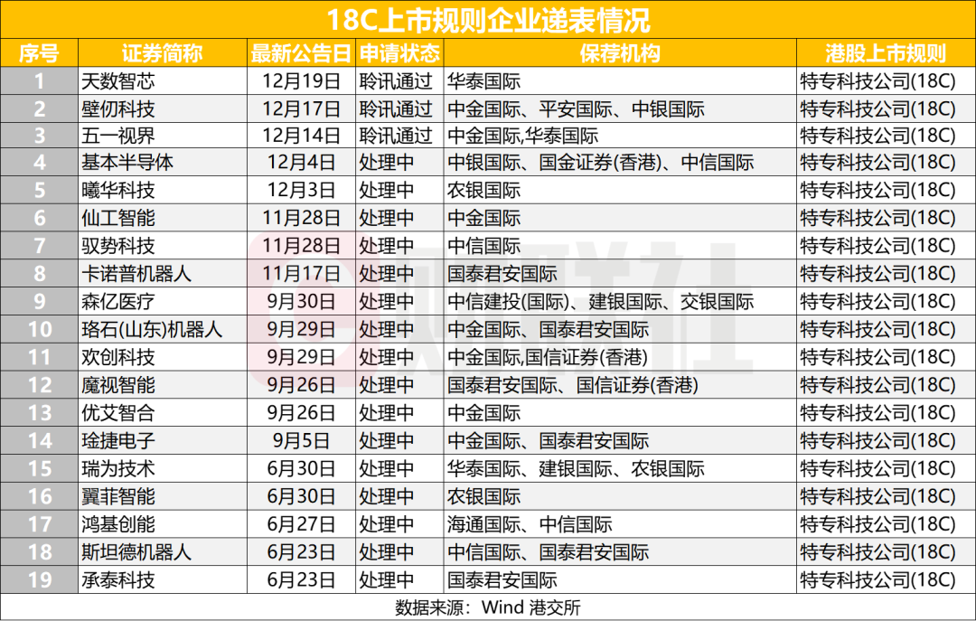 数据显示,港交所18C章特专科技上市制度正迎来企业递表高峰,2025年以来已有文远知行、滴普科技、云迹科技及希迪智驾四家企业通过该规则成功上市。据财联社记者不完全统计,目前以18C规则递表企业总数已达19家,其中,壁仞科技、天数智芯、五一视界已通过港交所聆讯。