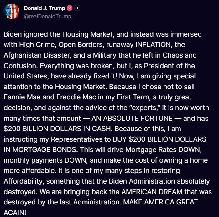 特朗普周四在社交媒体上发文宣布了此举,称“这将推动抵押贷款利率下降、月供减少,并使购房成本更可负担”。