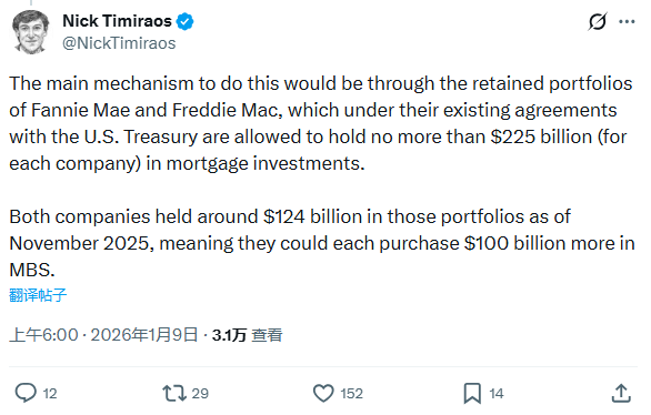 素有“新美联储通讯社”之称的著名记者Nick Timiraos表示,特朗普已指示代表购买价值2000亿美元的MBS,实现这一目标的主要机制就是通过房利美和房地美的自留投资组合。根据它们与美国财政部的现有协议,这两家公司各自持有的抵押贷款投资不得超过2250亿美元。而截至2025年11月,两家公司在这些投资组合中各持有约1240亿美元,这意味着它们各自可以再购买1000亿美元的MBS。
