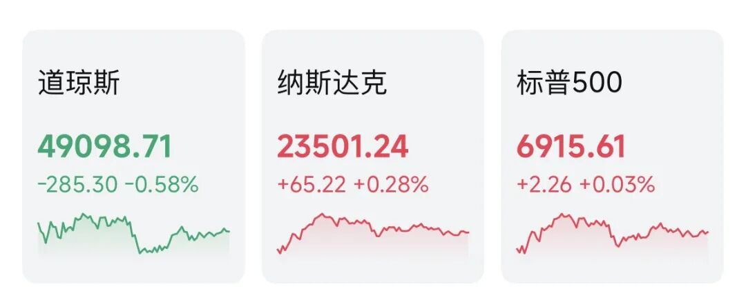 截至收盘,道琼斯指数跌0.58%,报49098.71点;标普500指数涨0.03%,报6915.61点;纳斯达克指数涨0.28%,报23501.24点。