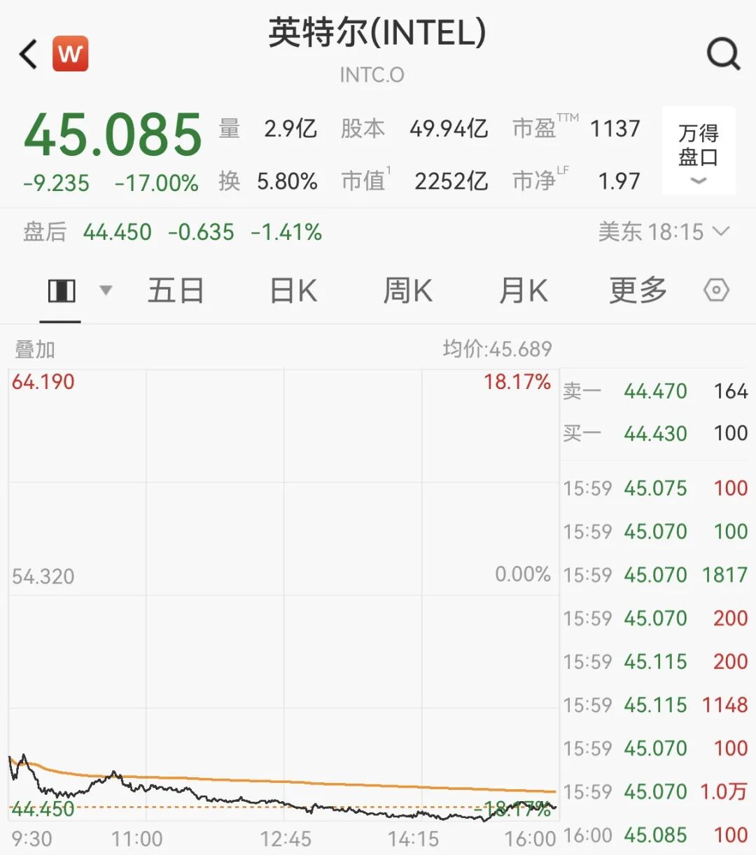 美东时间1月23日,芯片巨头英特尔暴跌17%,报45.085美元,最新总市值为2252亿美元。