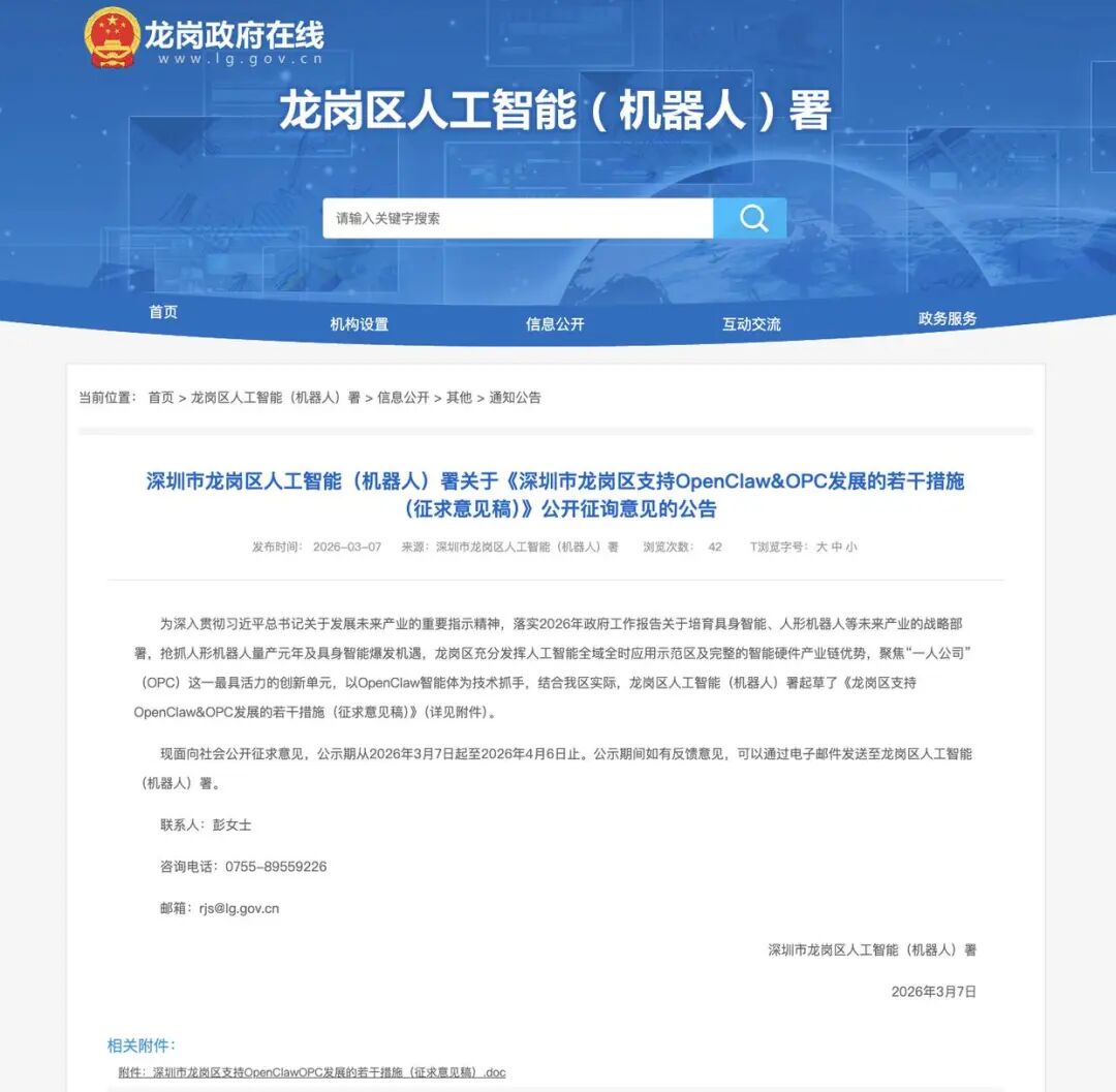 值得注意的是,为抢抓智能经济发展机遇,深圳市龙岗区于3月7日发布《深圳市龙岗区支持OpenClawundefinedOPC发展的若干措施(征求意见稿)》(以下简称:“龙虾十条”),拟以“零成本启动”为核心亮点,面向全球智能体开发者和OPC(One Person Company,一人公司)创业者抛出橄榄枝,打造全球智能体创业首选地。