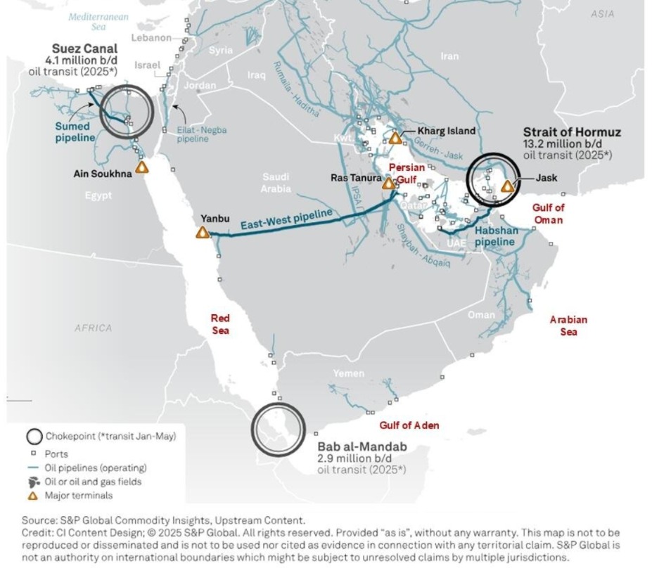 (沙特正把原油从波斯湾输向红海港口,来源:标普全球)