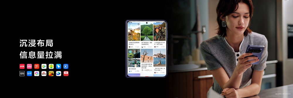 影音娱乐更沉浸:华为阅读推出“AI动态漫画”,直接呈现出生动的场景动效,联合哔哩哔哩漫画,在《百妖谱》、《凡人修仙传》等多部热门IP中,打造“从漫画里走出来”的沉浸感。在内屏使用鸿蒙版微信、抖音、小红书、快手、今日头条或QQ浏览器刷视频时,显示面积大幅提升,如果是观看4:3视频源时,面积是6.9英寸直板机的2.35倍。在浏览图文内容时,鸿蒙版抖音、小红书、哔哩哔哩、大众点评等应用都支持“左图右文”布局,轻松拿捏杂志范。在外屏使用鸿蒙版小红书、蜻蜓FM浏览信息流,可展示3列的图文卡片,信息量相较于直板机的2列,约提升了67%。更贴心的是,在鸿蒙版京东、小红书、哔哩哔哩、喜马拉雅、腾讯视频、钉钉、酷狗、知乎、大麦、飞书、蜻蜓FM等应用中滑动浏览信息时,功能栏还会智能隐藏,信息显示面积更大,让浏览更沉浸、更专注。