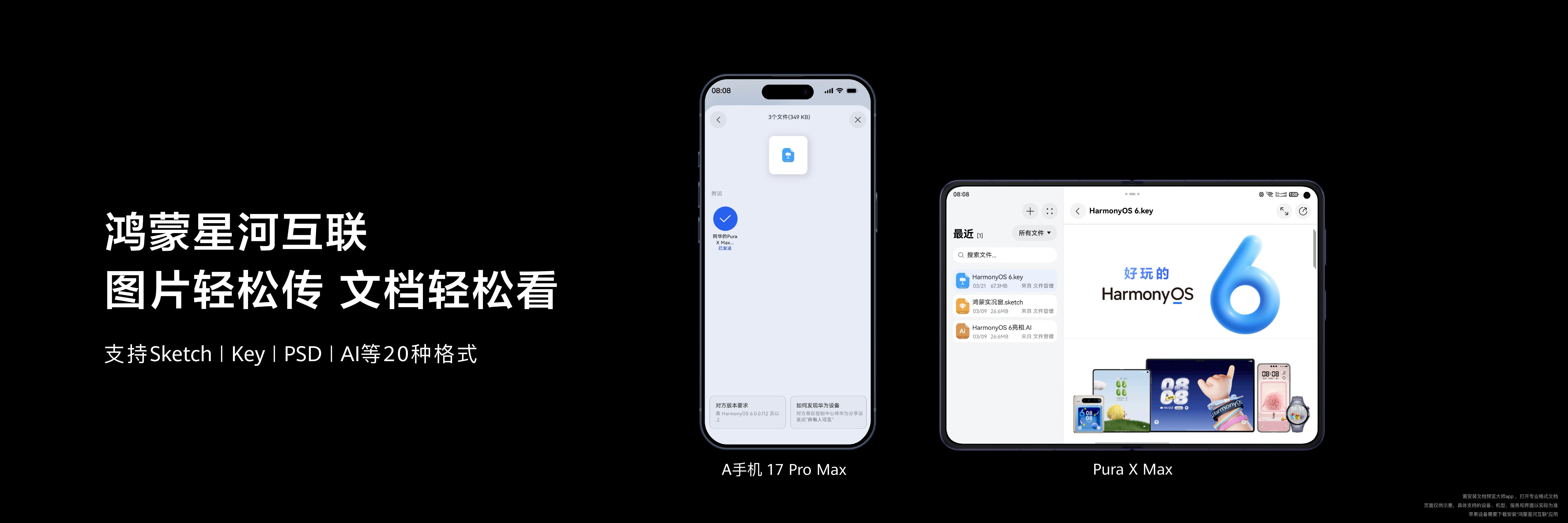 跨设备图片轻松传,文档轻松看:通过鸿蒙星河互联,iOS设备的图片和文档可以轻松分享给华为Pura X Max等鸿蒙终端设备,支持通过文档预览大师App打开Sketch、CAD等20种专业格式,解决了跨设备、跨格式文件查看和传输的难题。