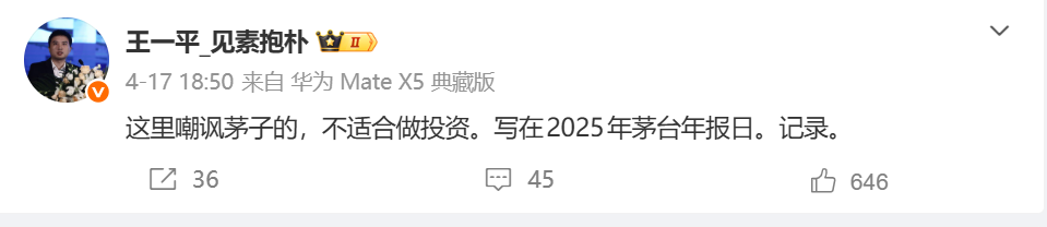 在贵州茅台大跌之后,王一平发文:“这里嘲讽茅子的,不适合做投资。写在2025年茅台年报日。”