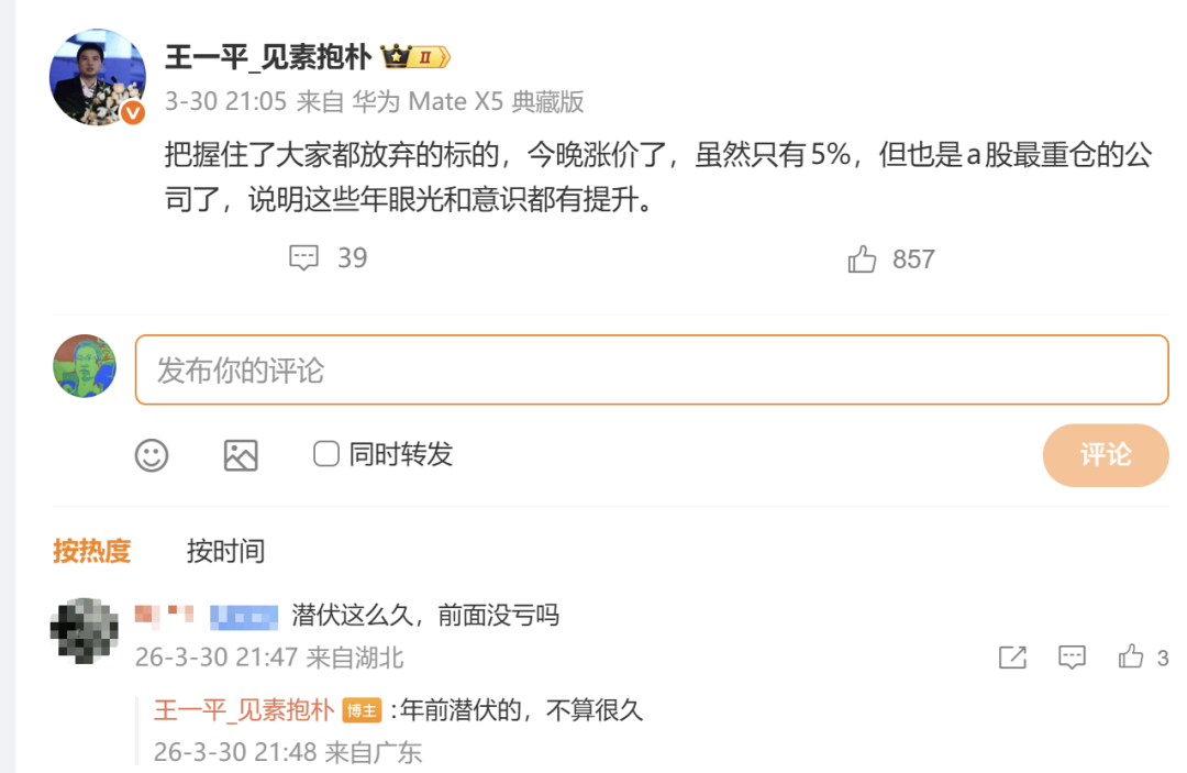 30日晚间,王一平在微博表示“把握住了大家都放弃的标的,说明这些年眼光和意识都有提升。”