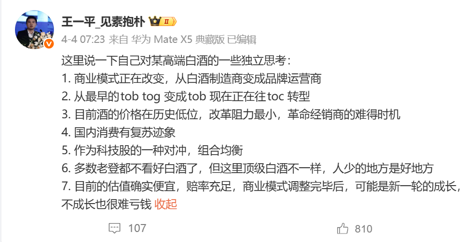 4月4日,王一平还发文谈及对某高端白酒的看法,并列出了看好的7大理由: