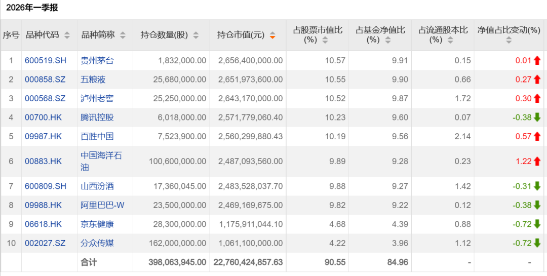 从最新披露的公募基金季报看,今年一季度,公募基金开始加码贵州茅台。天相投顾统计数据显示,2025年底降为公募第九大重仓股的贵州茅台,今年一季度排名上升,升至公募第五大重仓股。